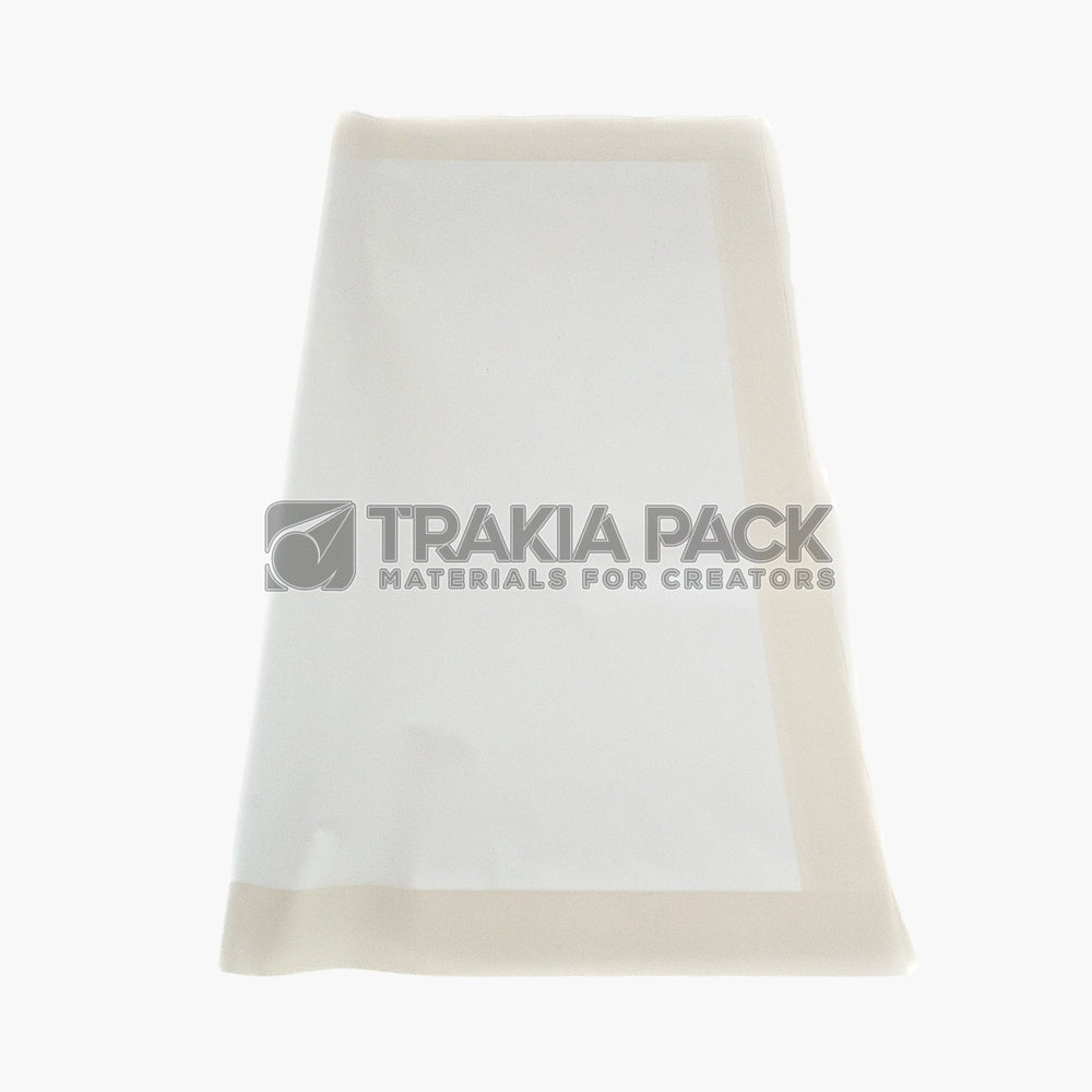 Бял целофан с широк кант, размер 58х58см, опаковка от 20 броя — идеален за стилно опаковане на букети и подаръчни аранжировки.