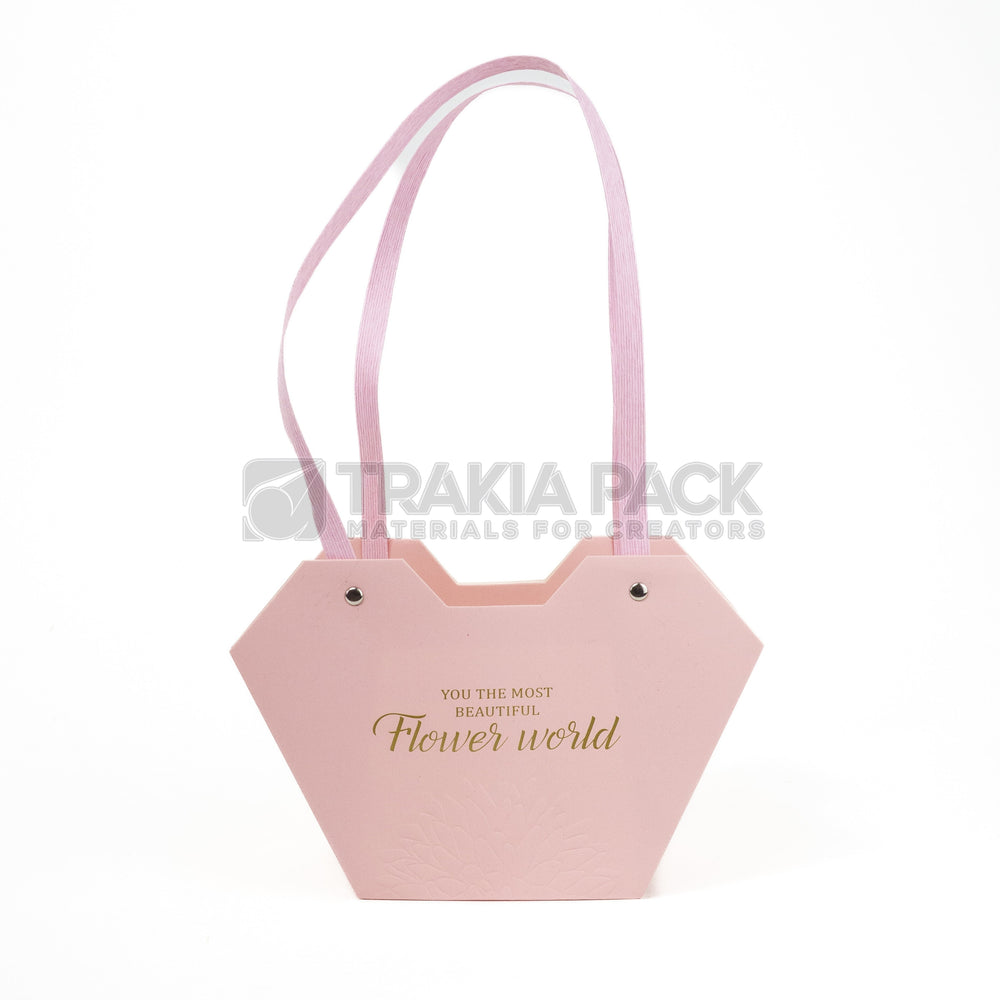 Розови хартиени чантички Flowers world в размер 23×15×9 см, подходящи за малки букети и подаръчни аранжировки. Изработени от плътна хартия с удобни дръжки за стабилно пренасяне.