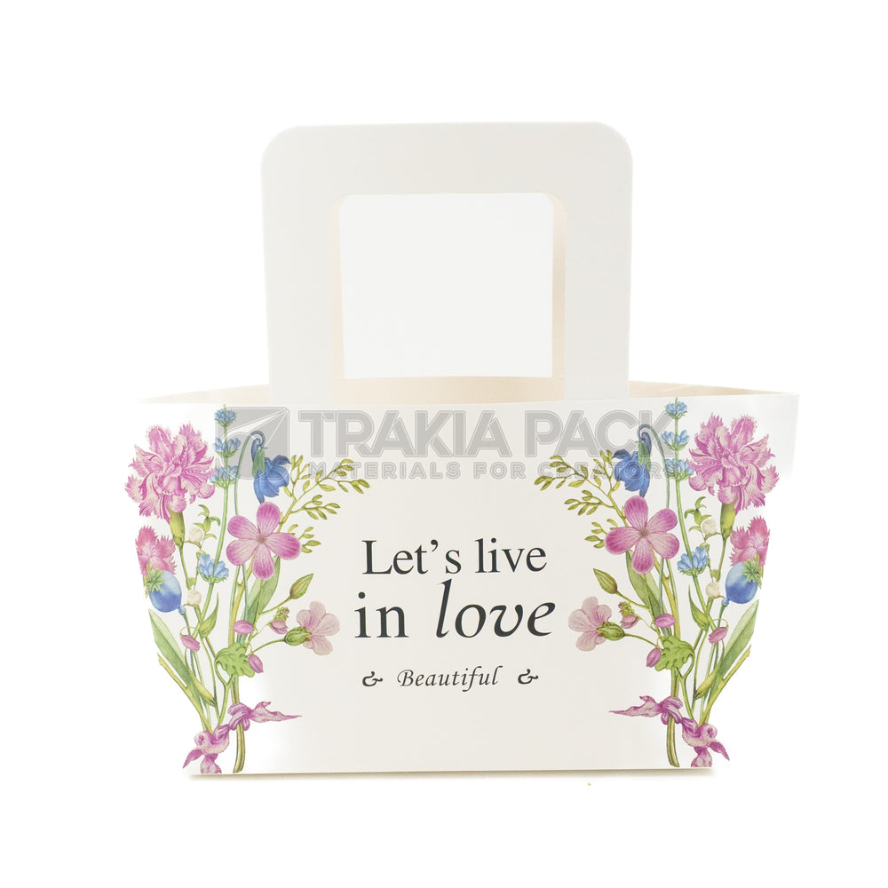 Бели хартиени чантички с надписи, с размер 28×8×14 см. Идеални за флорална аранжировка.