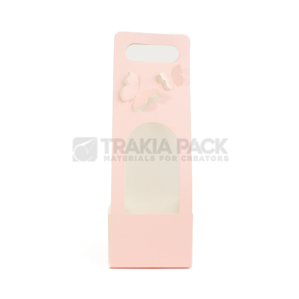 Високи хартиени розови чантички с пеперуди с размер 12×12×35 см, подходящи за удължени букети, цилиндрични кутии и подаръчета. Лесни за пренасяне и стабилни при натоварване.