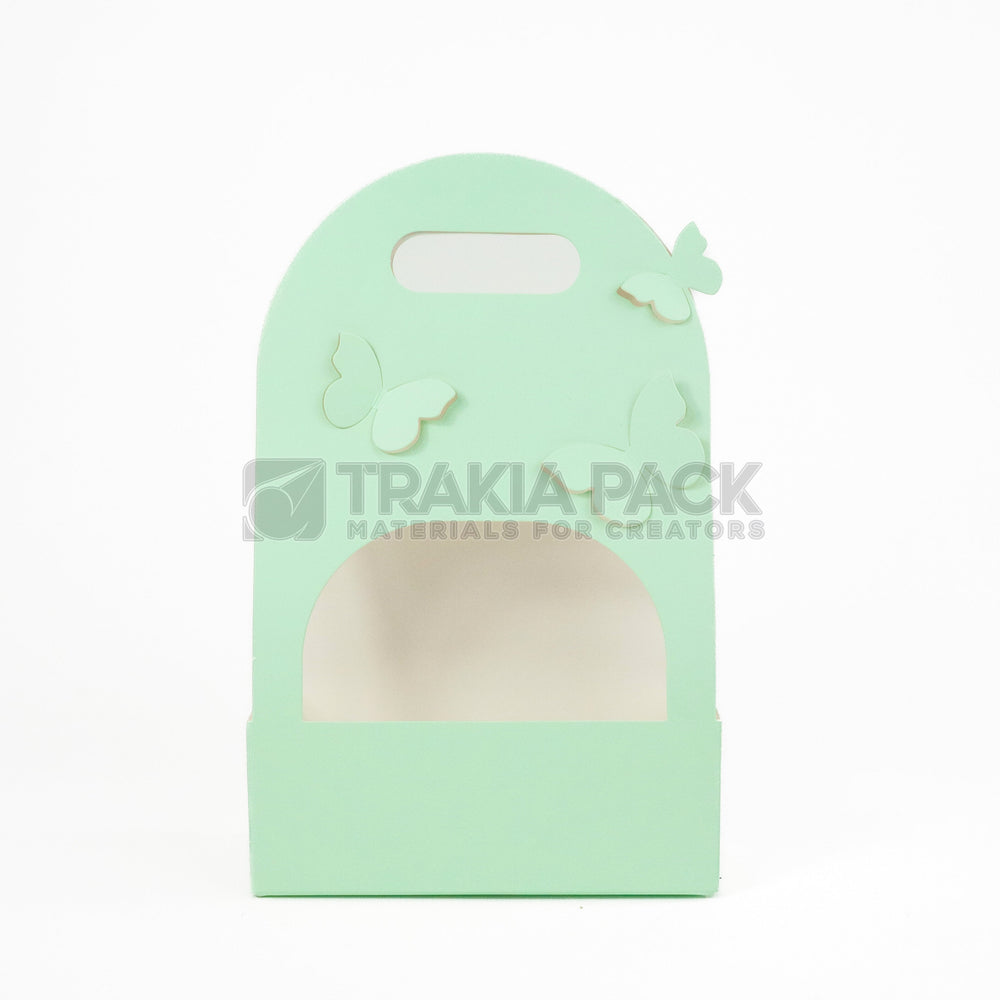 Зелени хартиени чантички с пеперуди в размер 20×8×32 см, подходящи за малки букети, сувенири и опаковки за подаръци.