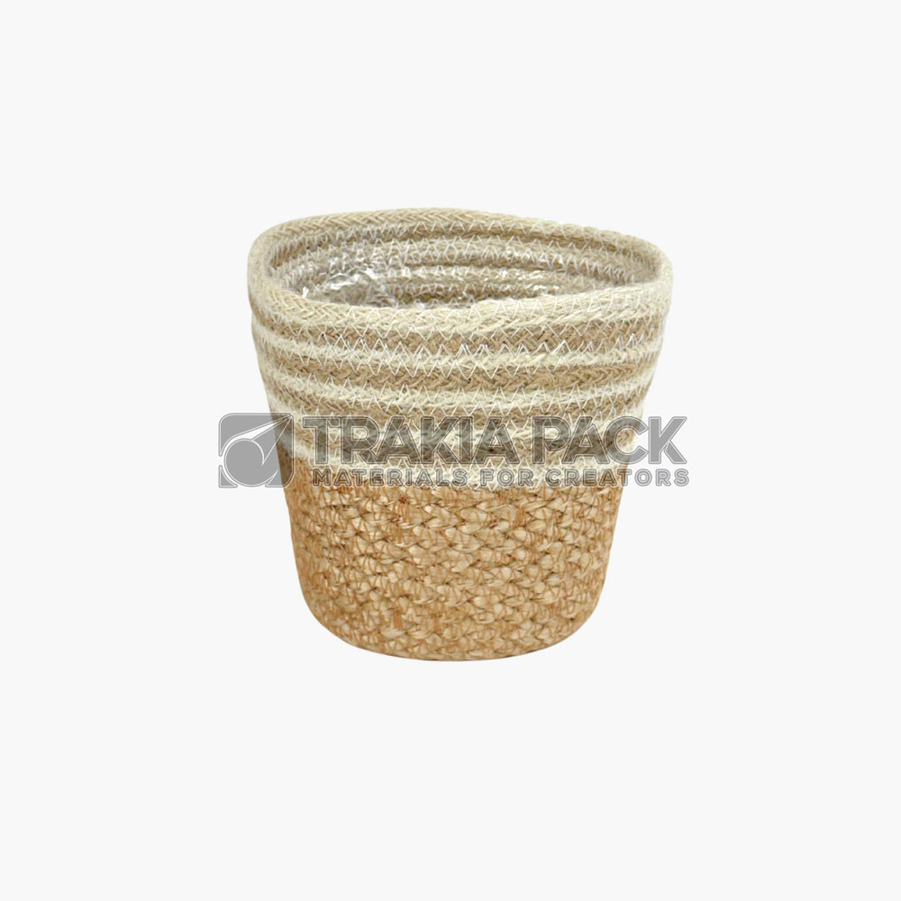 Плетена кашпа с бели райета и размер 13х13 см, подходяща за интериорни цветни аранжировки.