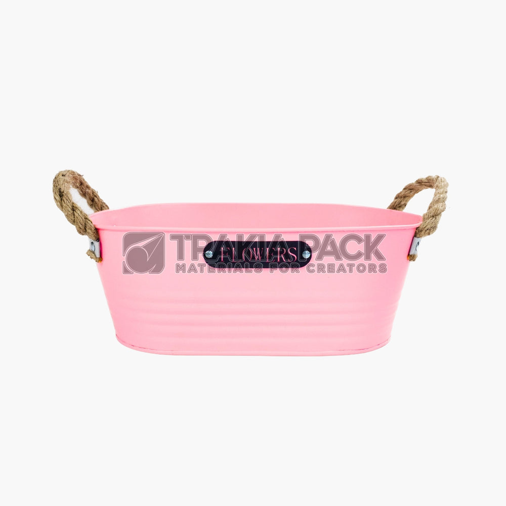 Метална розова кофичка елипса в размер 26х16х10см, подходяща за цветни аранжировки, саксийни растения и декоративни композиции. Практичен и устойчив цветарски консуматив за магазини и декоратори.