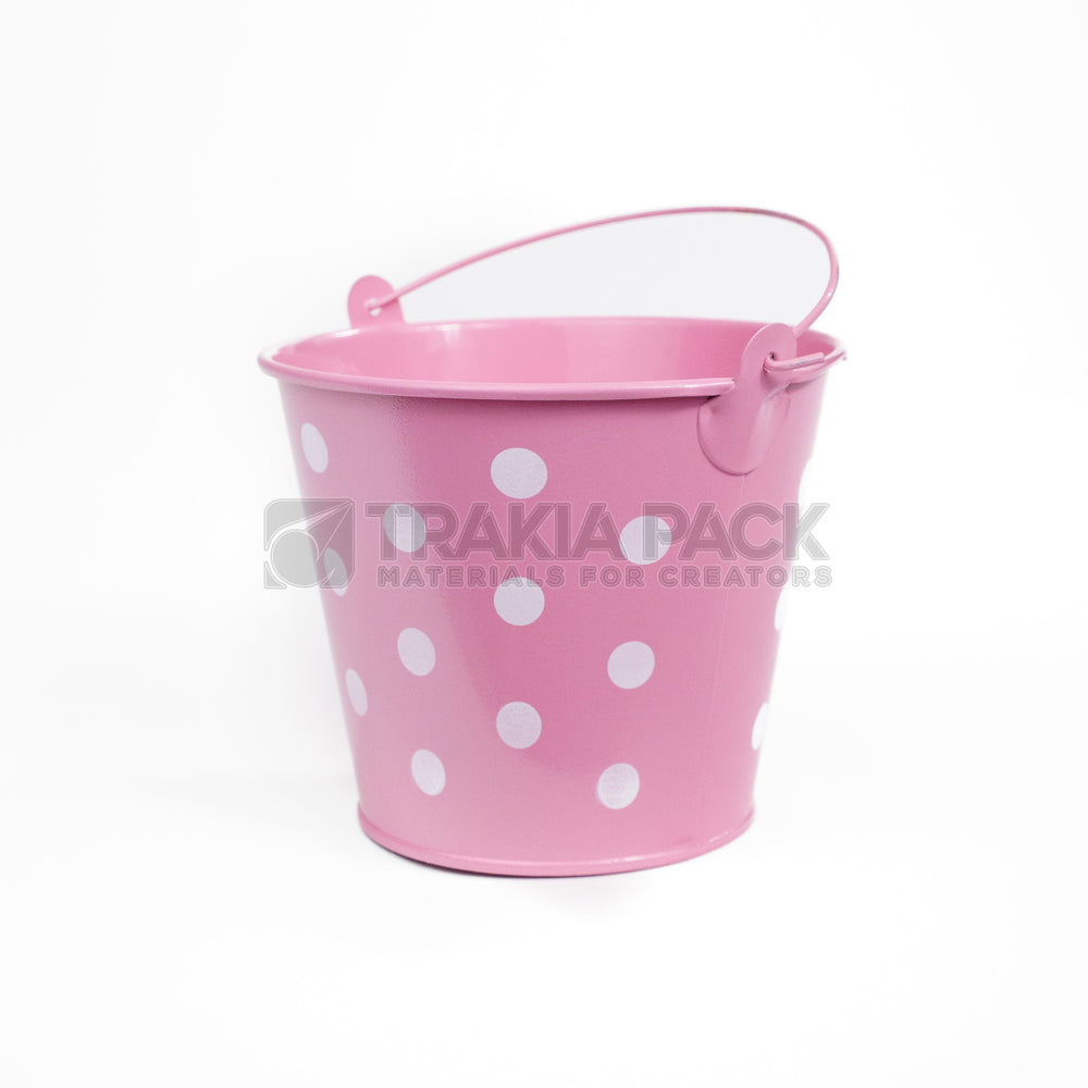 Малка розова метална кофичка на точки в размер 10х9,6х5 см — чудесна за мини декорации, сухи цветя и подаръчни акценти. Компактна, сладка и универсална за всяка цветарска идея.