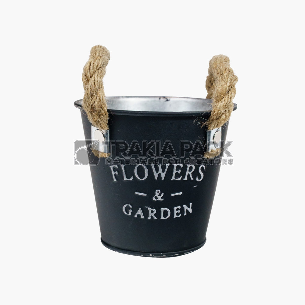Черна метална кофичка с канапена дръжка, размер 13х12 см, подходяща за цветя и декор.
