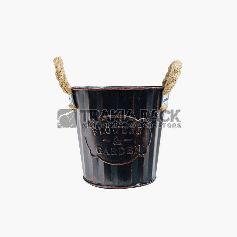 Черна метална кофичка с канапена дръжка във винтидж стил, размер 14х13 см, подходяща за декор и цветя.