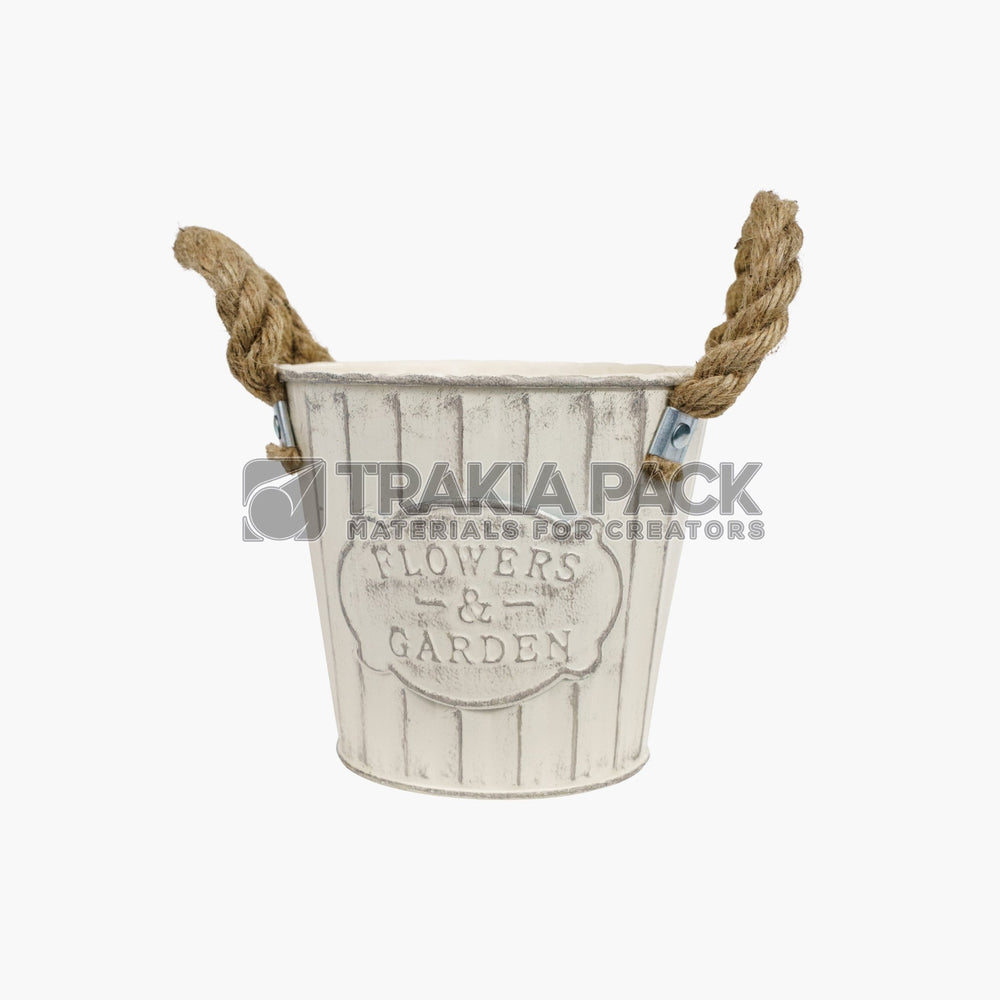 Метална кофичка в цвят екрю, с канапена дръжка във винтидж стил, размер 14х13 см, подходяща за декор и цветя.