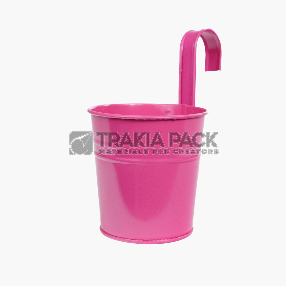 Метална кофичка с кука в цвят циклама, размер 9,5х10 см, подходяща за декорация и малки цветни аранжировки.
