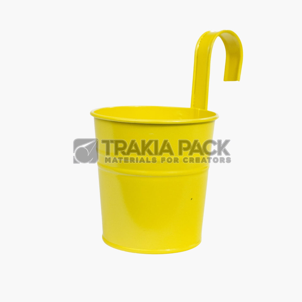 Жълта метална кофичка с кука, размер 9,5х10 см, подходяща за декорация и малки цветни аранжировки.