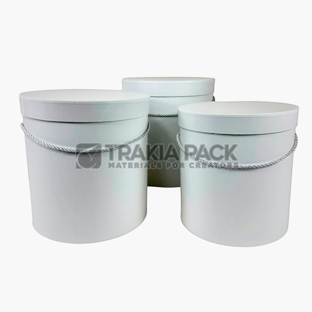 Комплект от 3 броя бели цилиндрични кутии, като най-голямата е с размер 24х26см. Подходящи са за подаръчни аранжировки и флорални композиции.