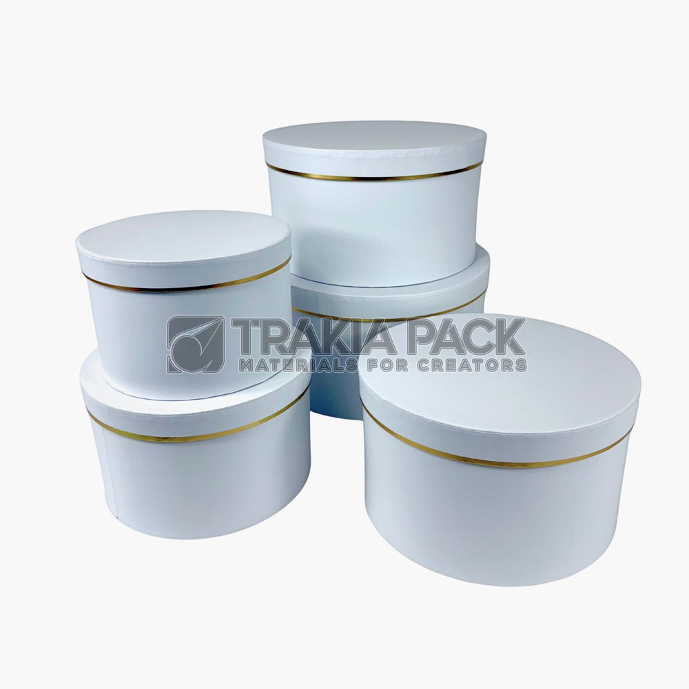 Комплект от 5 броя бели кръгли кутии със златен кант. Идеални за луксозни букети и флорални композиции. Размери: 30x16см; 27x15см; 24x14см; 21x13см; 18x12см.