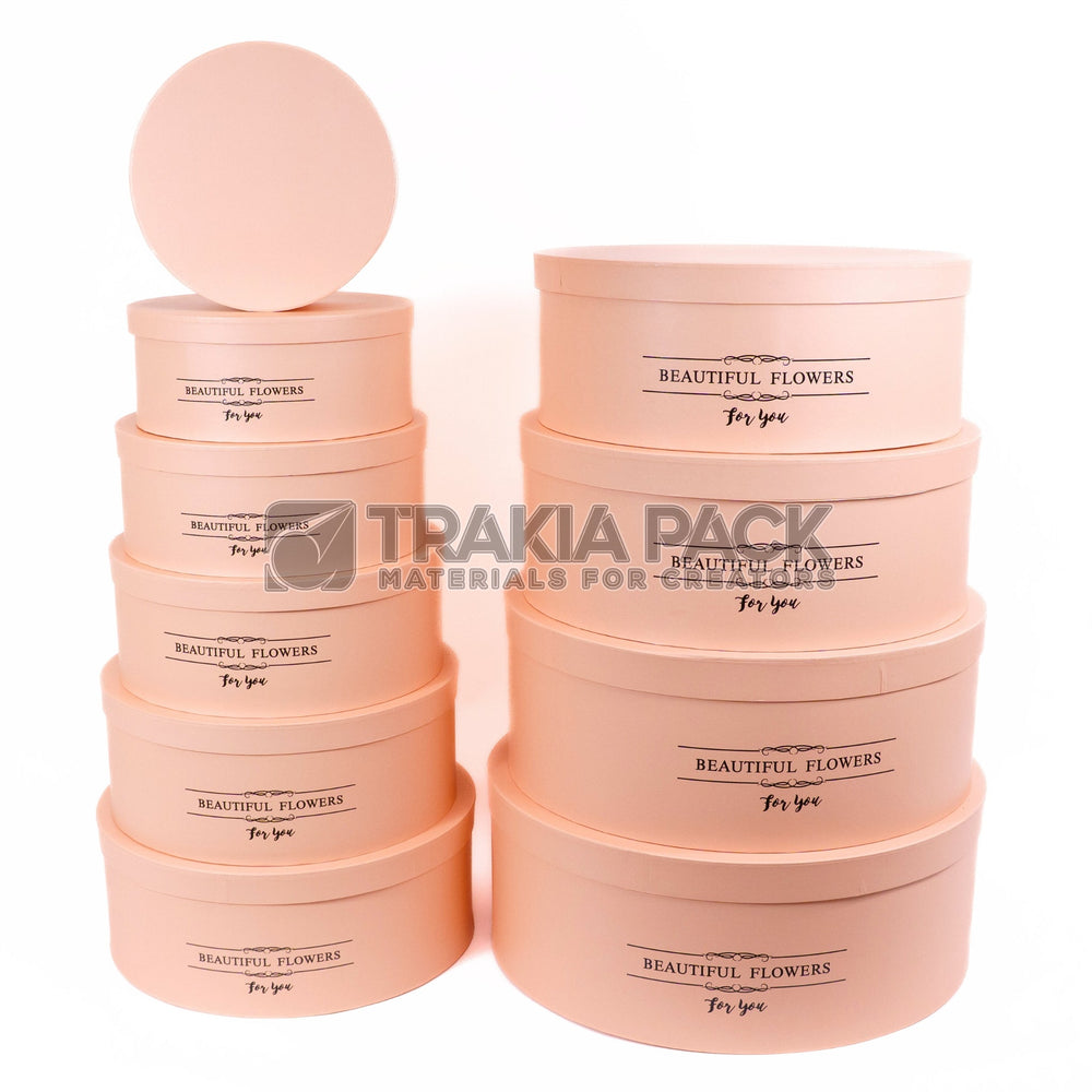 Луксозен комплект от 10 розови кръгли кутии с надпис Beautiful flowers for you. Подходящи са за премиум букети, подаръчни сетове и модерни декорации. Размери: 52x52x19,5см; 49х49x18,5см; 46х46х17,5см; 43х43х16,5см; 40х40х15,5см; 37х37х14,5см; 34х34х13,5см; 31х31х12,5см; 28х28х11,5см; 25х25х10,5см.