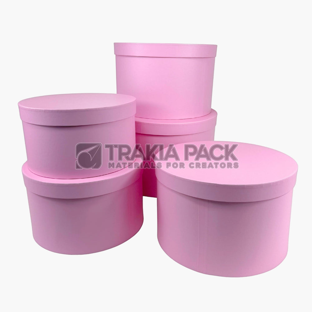 Комплект от 5 броя розови кръгли кутии, подходящи за аранжиране на букети и опаковане на подаръци. Размери: 32х21см; 9,8х19см; 27,5х17см; 25,5х15см; 23,5х13см.