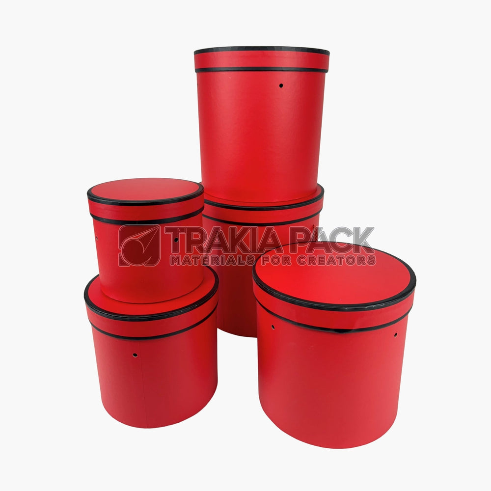 Комплект от 5 броя червени цилиндрични кутии с кант, подходящи за цветни аранжировки, букети и подаръчни композиции. Размери: 25х25х25см; 22х22х23см; 20х20х20см; 18х18х17см; 16х16х13см.