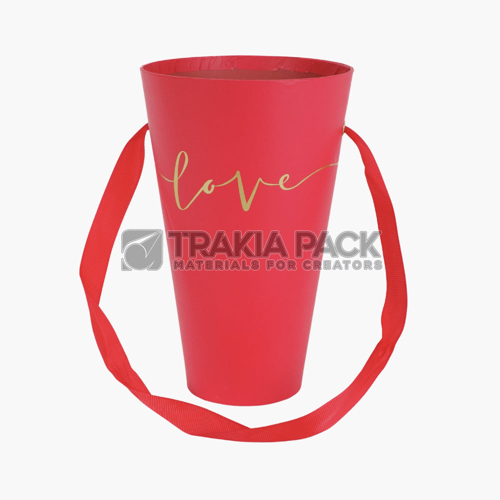Червена кутия конус с връзка, размер 13,5х22х8 см, идеална за подаръчни и празнични флорални композиции.