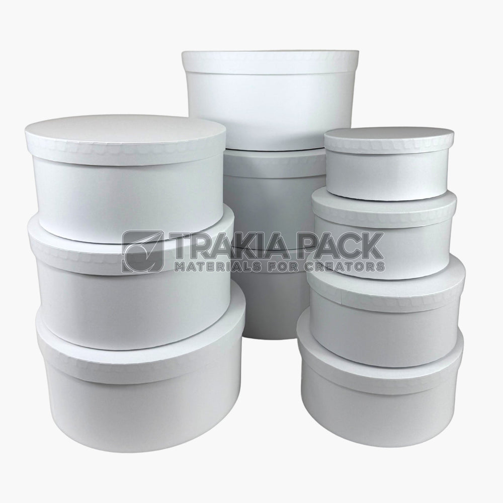 Комплект от 10 броя бели обли кутии, подходящи за аранжиране на букети и опаковане на подаръци. Размери: 34,5x16,7см; 32,5х15,7см; 30,5х14,7см; 28,5х13,7см; 26,5х12,7см; 24,5х11,7см; 22,5х10,7см; 20,5х9,7см; 18,5х8,7см; 16,5х7,7см.