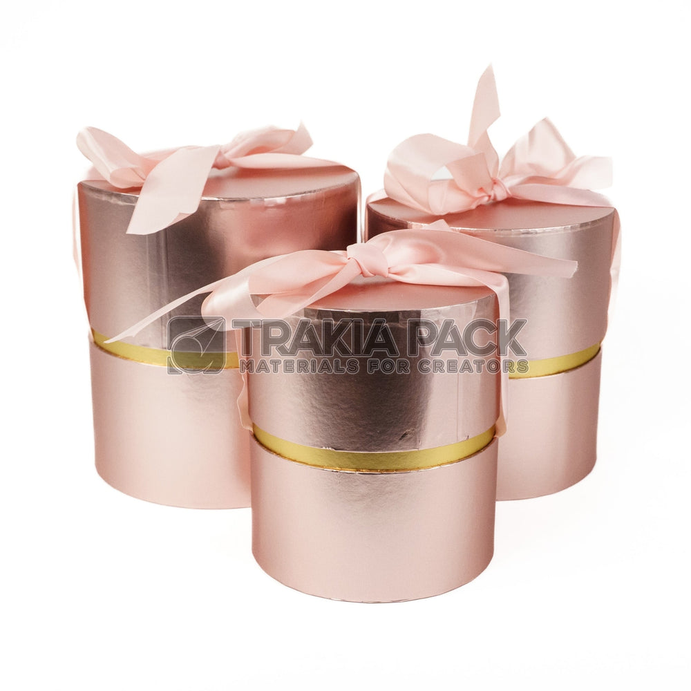 Елегантен комплект от три цилиндрични металик кутии в розово. Идеални за букети, подаръци и празнични аранжировки. Размери: 19,5x21,5см; 17,5х19,5см; 15,5х17,5см.