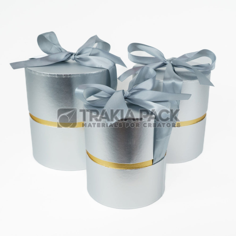 Елегантен комплект от три цилиндрични металик кутии в сребърно. Идеални за букети, подаръци и празнични аранжировки. Размери: 19,5x21,5см; 17,5х19,5см; 15,5х17,5см.