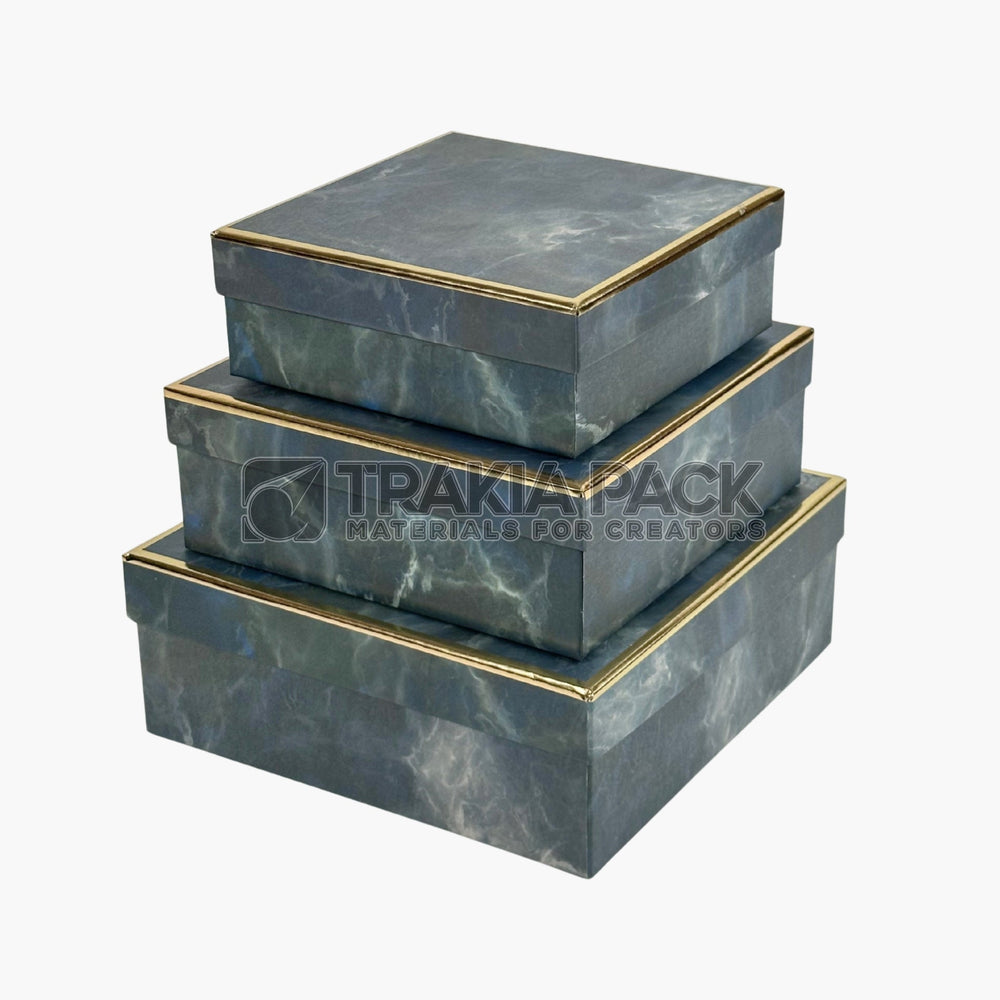 Комплект от 3 броя квадратни кутии с мраморен ефект в сиво, идеални за луксозни цветни аранжировки или подаръчни композиции. Размери: 23х23х9см; 20х20х8см; 17х17х7см.