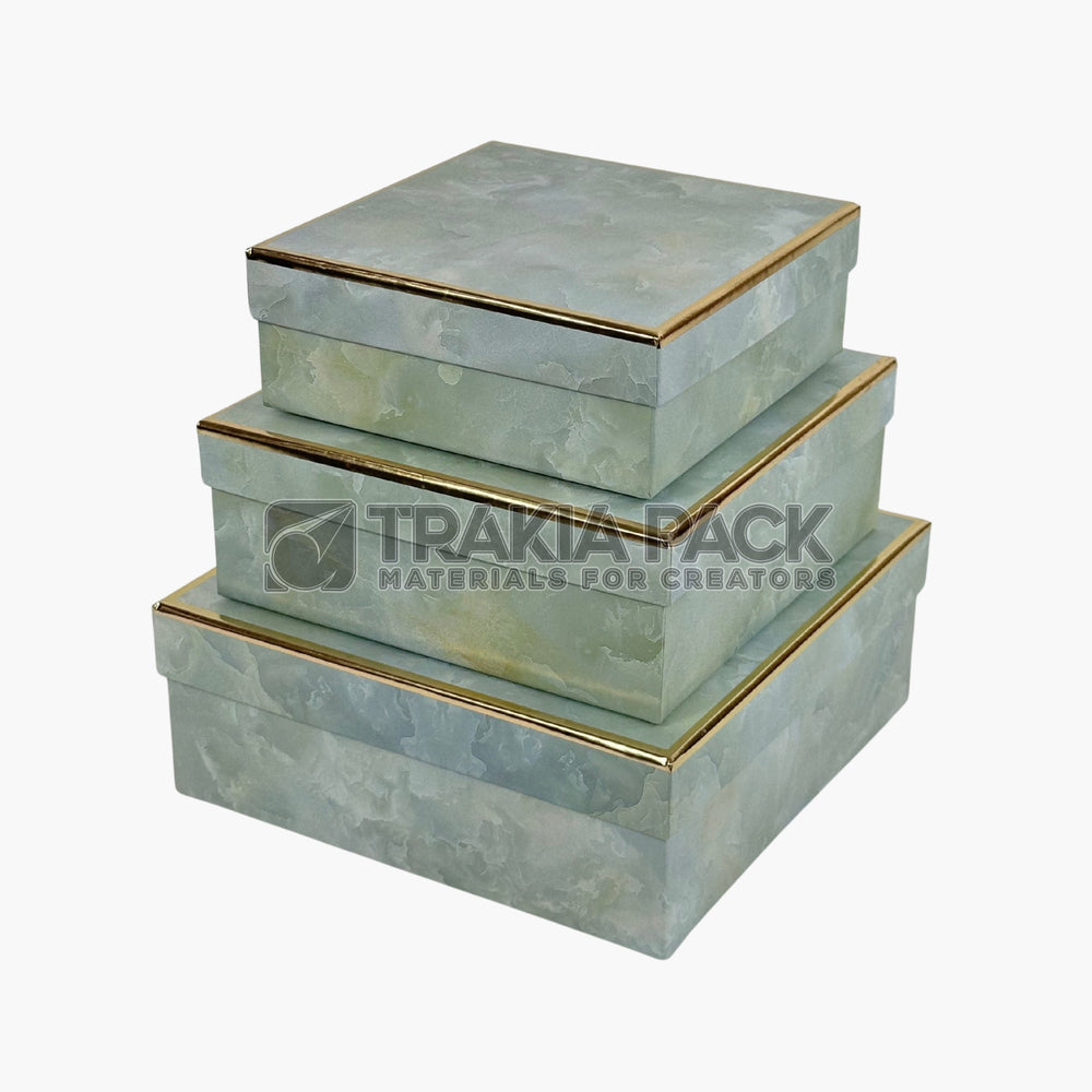 Комплект от 3 броя квадратни кутии с мраморен ефект в зелен цвят, идеални за луксозни цветни аранжировки или подаръчни композиции. Размери: 23х23х9см; 20х20х8см; 17х17х7см.