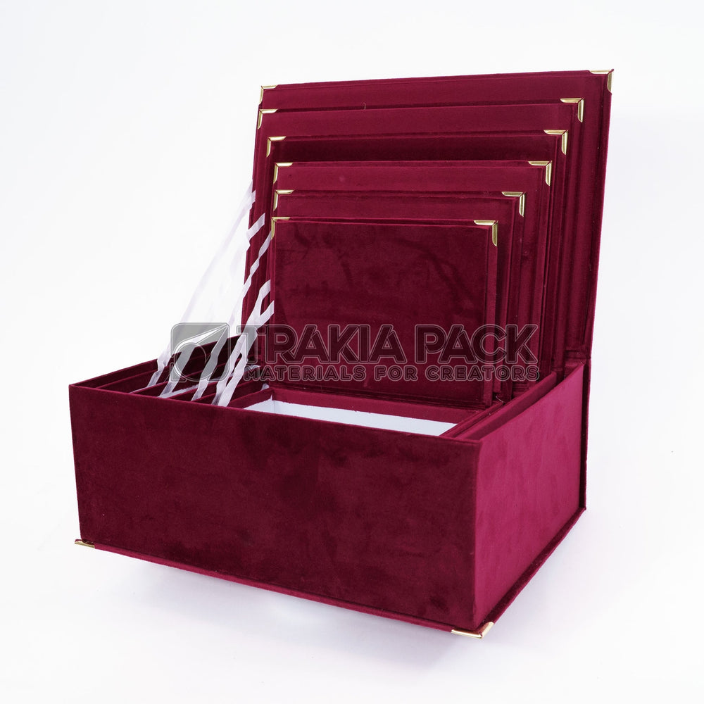 Комплект от 6 броя велурени кутии с капак в бордо. Подходящи за големи подаръчни сетове, букети, аранжировки с вина, сладки изкушения, корпоративни подаръци и тематични декорации. Размери: 39,5х27,5х15см; 36,5х25,5х13,5см; 33,5х23,5х12см; 30,5х21,5х10,5см; 27,5х19,5х9см; 24,5х17,5х7,5см.