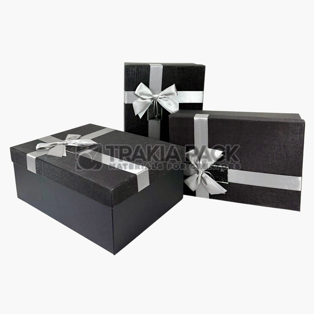 Комплект от 3 големи черни кутии с панделка, подходящи за цветя и подаръчни композиции. Размери: 39х28х15см; 37х26х12,5см; 35х24х10см.