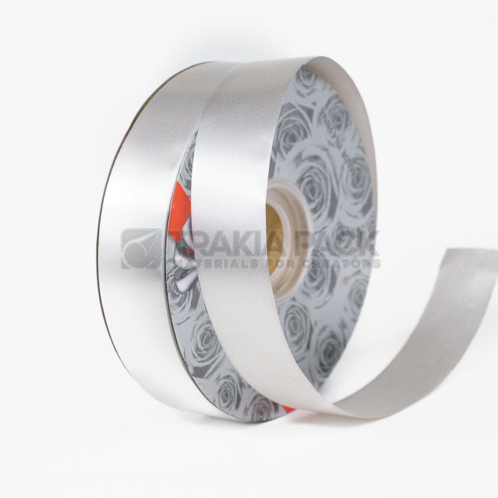 Блестяща панделка гланц 2,5см/91м в сребърно. Перфектна за празнични букети, коледни подаръци и ефектни декорации.