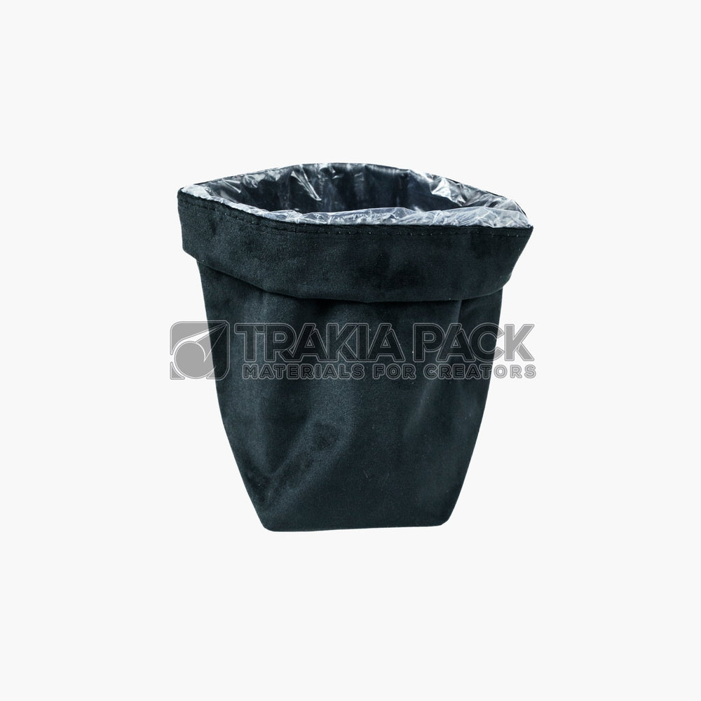 Черна велурена торбичка с размер 18х23х13см, подходяща за цветя, подаръчни комплекти и елегантно опаковане. Практично и стилно решение за цветарски магазини и декоратори.