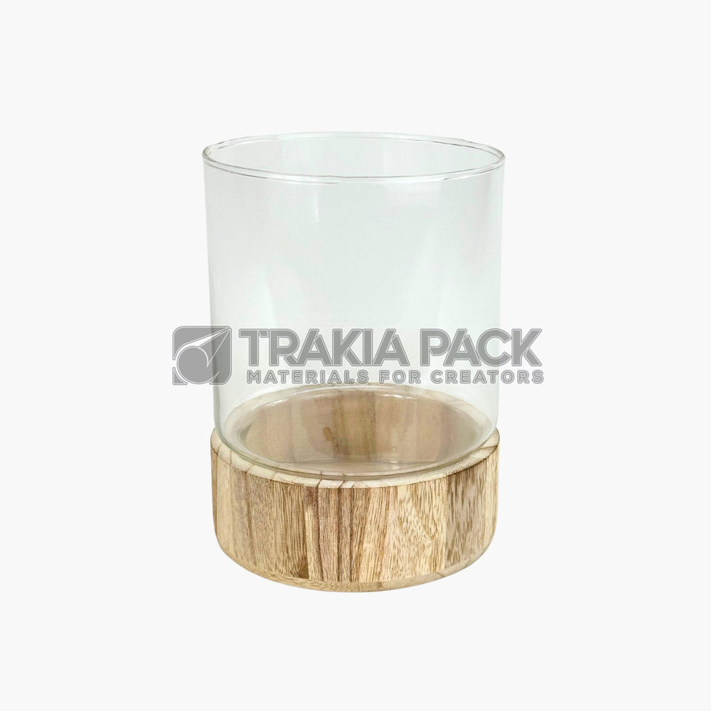 Стъклена ваза/свещник цилиндър с дървена основа - 14х19см