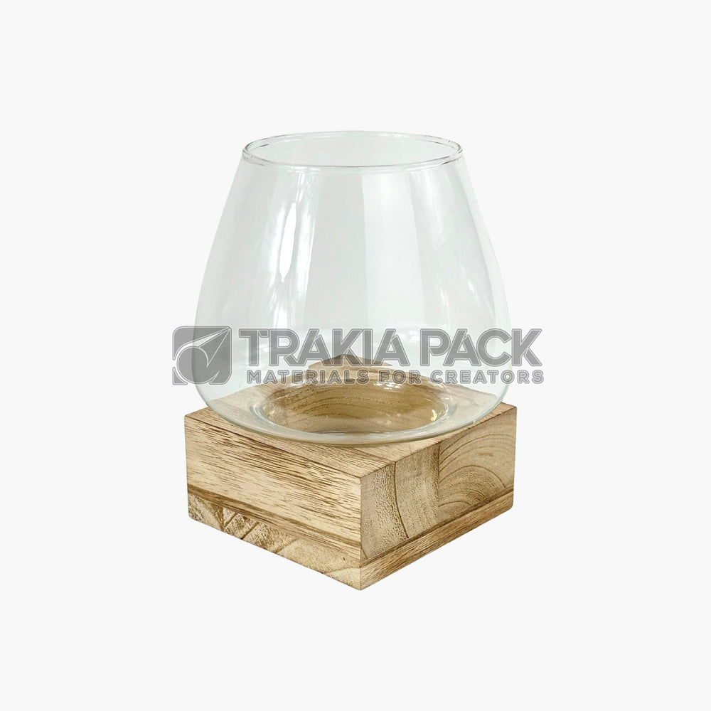 Стъклена ваза или свещник с дървена основа и размер 11х20 см, подходяща за модерни декоративни композиции.