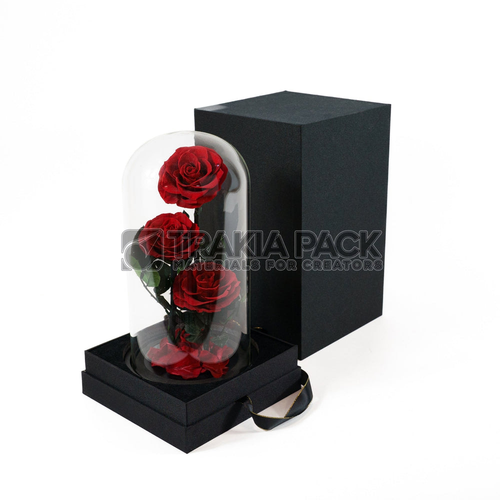 Елегантна вечна роза в стъкленица с луксозна подаръчна кутия, с размер 30х17 см, подходяща за стилен подарък и дълготрайна декорация.