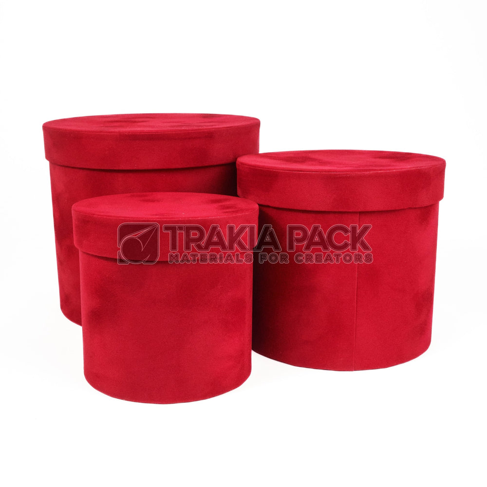 Комплект от 3 броя червени велурени кутии с капак. Идеални за изработване на елегантни flower box аранжировки, букети и празнични декорации.