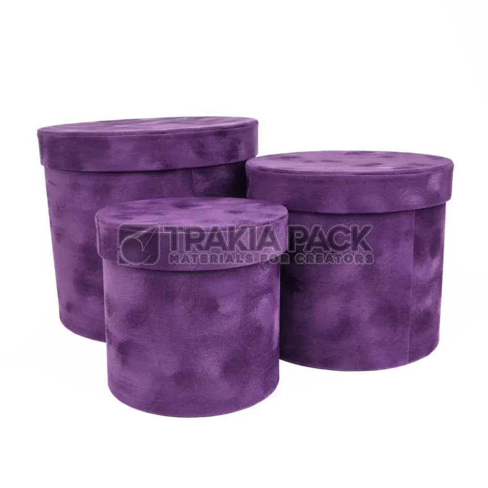 Комплект от 3 броя лилави велурени кутии с капак. Идеални за изработване на елегантни flower box аранжировки, букети и празнични декорации.