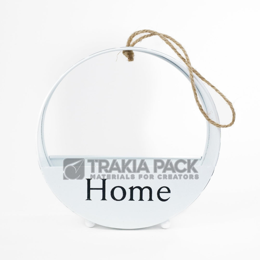 Кръгла метална бяла стойка с надпис Home, размер 20х6,2 см, подходяща за поставяне на саксии, аранжировки и декоративни елементи. Практичен аксесоар за цветарски магазини и интериорна декорация.