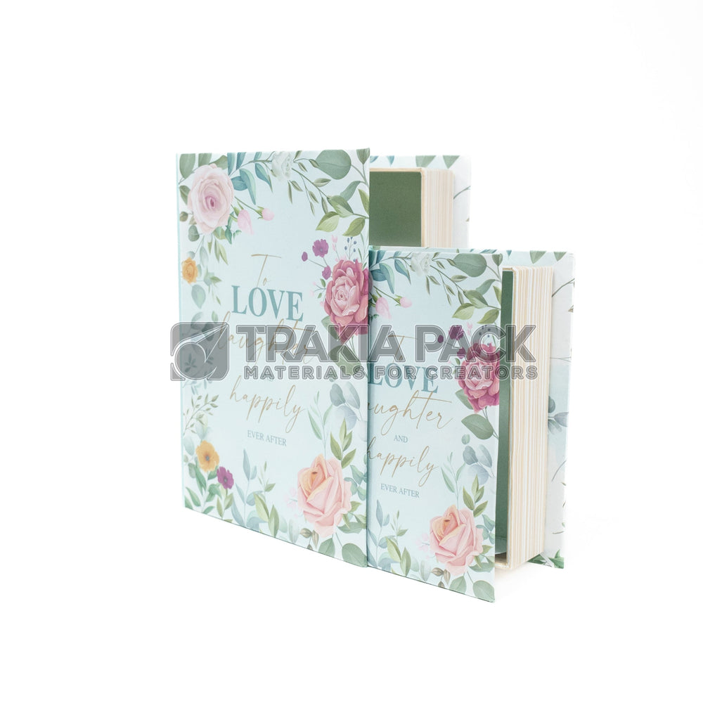 Сет от 2 броя сини кутийки тип книга, подходящи за различни флорални или декоративни аранжировки. Размери: 15х12х4,5см; 11,5х9х3,5см.