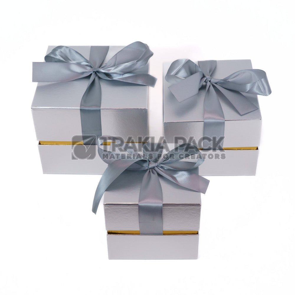 Комплект от три квадратни металик кутии в сребърно. Подходящи за цветни аранжировки, подаръчни сетове и луксозно опаковане. Размери: 22х22х16см; 19х19х14см; 16х16х12см.