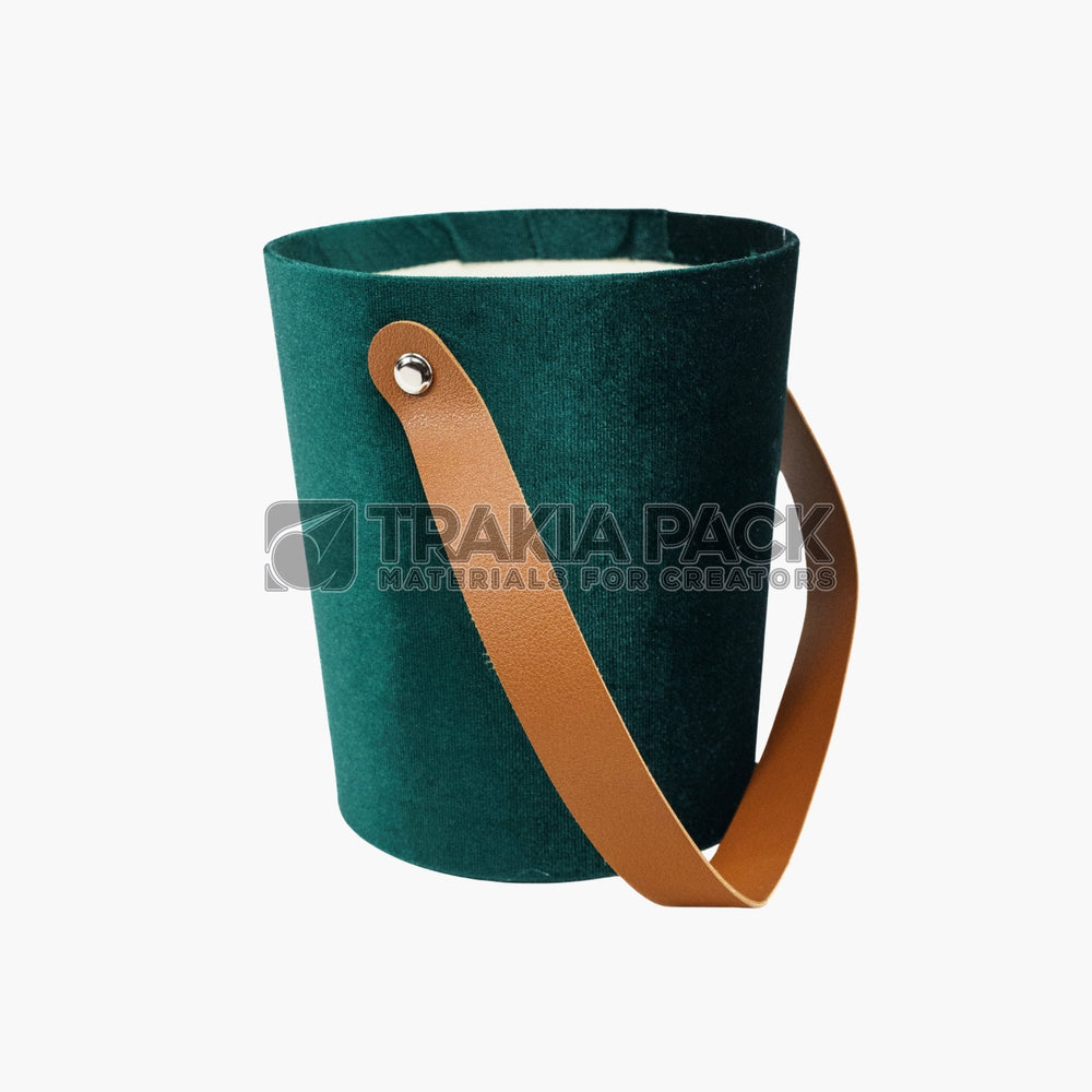 Зелена велурена кутия в с кожена дръжка и размери 14х15х12 см, подходяща за цветни аранжировки и луксозно подаръчно опаковане.