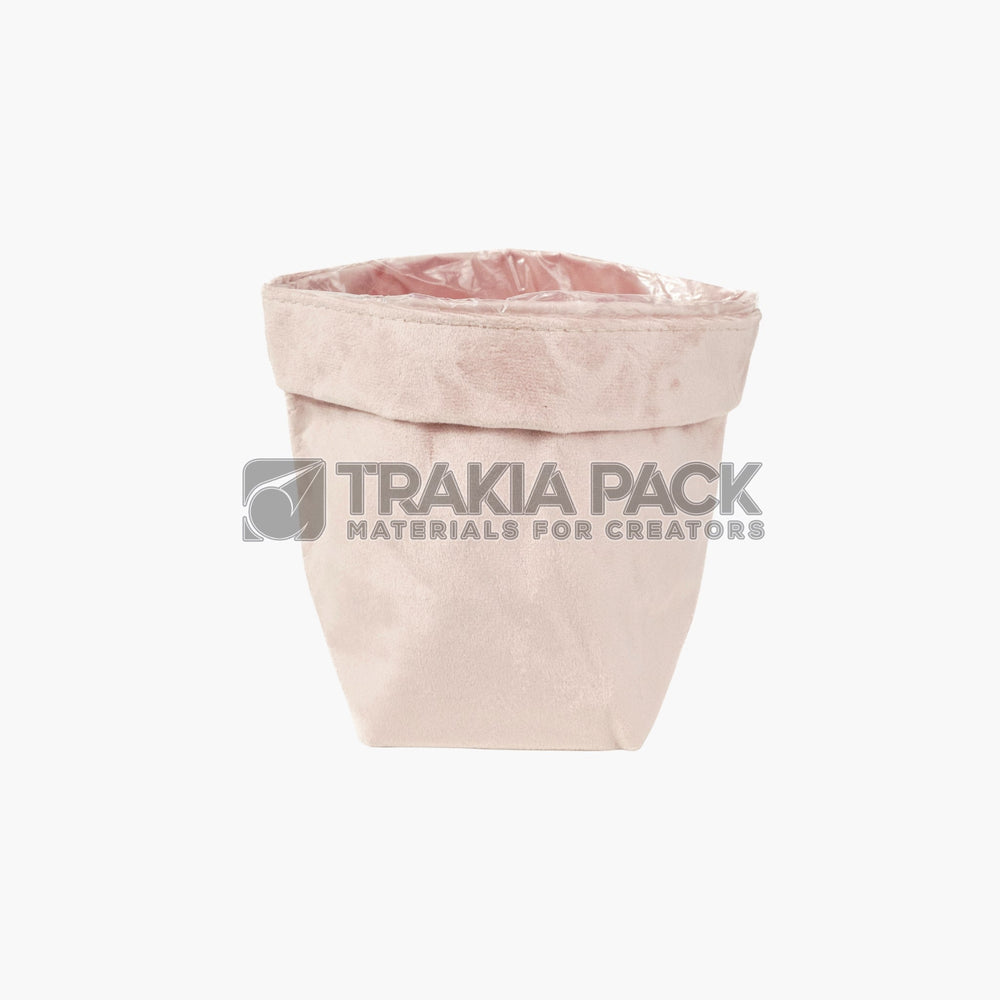Розова велурена торбичка с размер 18х23х13см, подходяща за цветя, подаръчни комплекти и елегантно опаковане. Практично и стилно решение за цветарски магазини и декоратори.